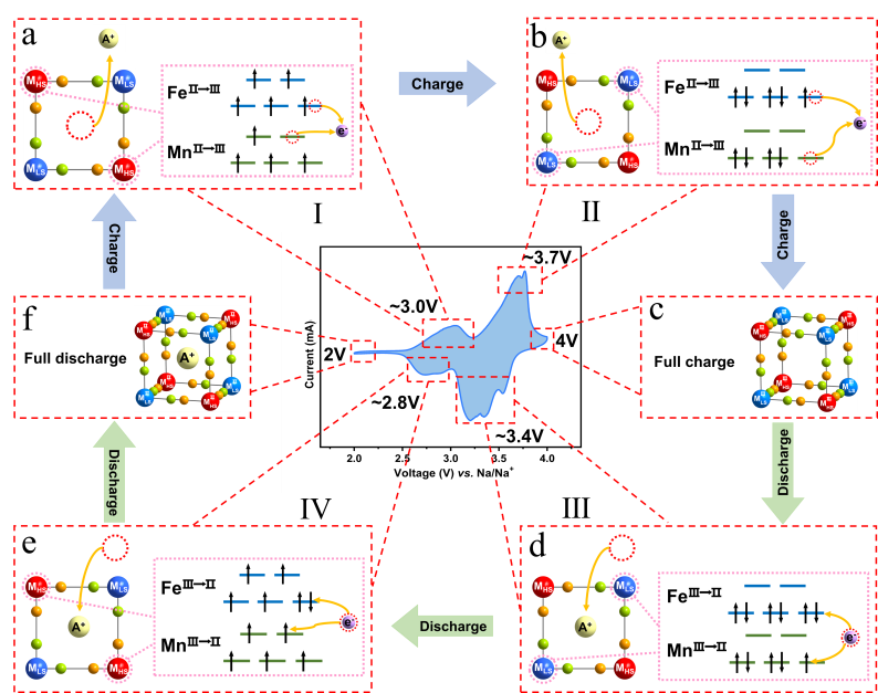 值得一提的是,研究团队观察到了四个引人注目的同步转变过程:在结构上,锰离子逐渐从样品中浸出,与此同时,铁和钾离子则有序地嵌入其中;在自旋状态上,低自旋锰离子的数量呈现减少趋势,而铁离子的氧化态则相应降低;在形态上,由于前述的结构变化,样品的形貌实现了从立方体到开放笼状的华丽转变;在性能上,自旋状态的变化直接引发了低电位平台电位的降低和高电位平台电位的升高。