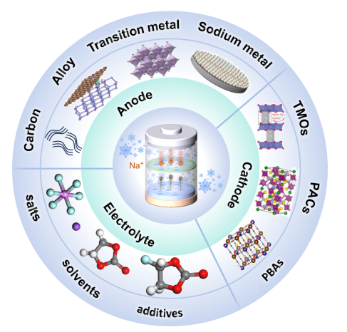 凭借低温耐受性,钠离子电池(SIBs)被认为是锂离子电池在高纬度、高寒、深空和深地环境的补充。然而,由于电极材料Na+扩散动力学迟缓和不稳定的电极-电解液界面反应,SIBs的低温性能仍然是一个挑战。因此,电极设计和电解液优化对提升SIBs低温性能具有重大意义。在这篇综述中,重点强调低温SIBs的电解液、负极和正极材料的研究和挑战,重点关注电极材料中的Na+存储机制和电解液的组成。此外,还总结了提高低温性能的相关策略,包括选择钠盐阴离子、使用多溶剂组分和在电解液中添加添加剂;以及正极的缺陷、界面和纳米结构工程;负极的形态、元素掺杂和孔结构工程。最后,综述深入分析了溶剂化的Na+结构和电极/电解液界面机制,并为电极材料的设计提供了见解,旨在促进SIBs在低温条件下的性能提升与应用。