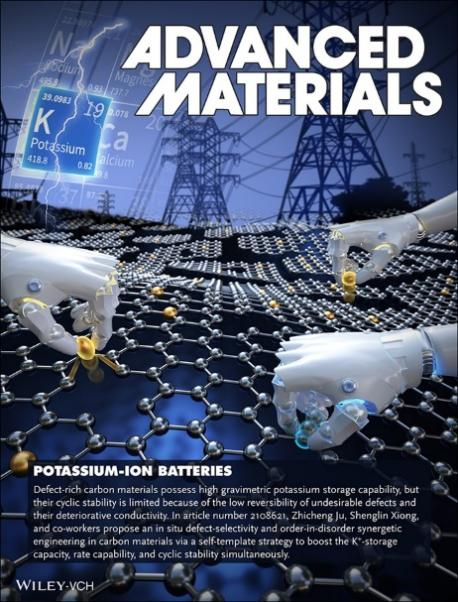 2.Yaxin Chen, Xi Baojuan, Huang Man, Shi Liluo, Huang Shaozhuan, Guo Nannan, Li Da, Ju Zhicheng*, and Shenglin Xiong*, Defect-Selectivity and “Order in Disorder” Engineering in Carbon for Durable and Fast Potassium Storage, Advanced Materials, 2022, 34, 2108621. (Frontispiece,ESI高被引)