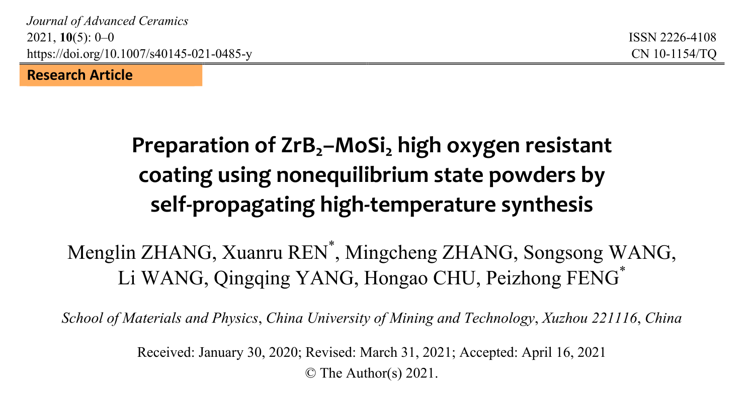 Relevant research results were published in the Journal of Advanced Ceramics (IF=6.707) with the title " Preparation of ZrB2-MoSi2 high oxygen resistant coating using nonequilibrium state powders by self-propagating high-temperature synthesis".