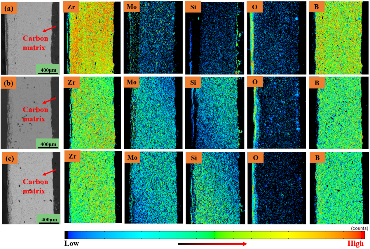 The interior of the coating is still dominated by ZrB2, and there are no penetrating cracks or large holes, indicating that the three coating samples of ZM20-ZM40 display excellent effects of blocking oxygen penetration at 1973 K. However, an interesting phenomenon is likewise discovered in the spectra of Si element, that is, all coating samples have the absence of Si elements under the glass layer, which is called Si-depleted layer. The same as the pure ceramic sample, in the interior of the coating samples, the O element penetration of the SHS-ZM20 component is supreme, which further verifies that the oxidation pores formed by high content of boride will turn into the channel of oxygen diffusion, resulting in generous oxygen penetration.