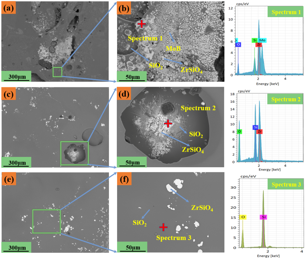 Plenty of ZrSiO4 and ZrO2 are precipitated from the high content of ZrB2, the low content of silicide leads to the insufficient supply of SiO2 glass on the surface, and the oxide particles cannot be homogeneously dispersed, resulting in the oxide agglomeration.However, the surface of the ZM40 coating sample tends to be flat, without obvious holes and cracks. With the increase of MoSi2 content, the oxygen diffusion rate of oxidation product SiO2 is relatively low. At the ultra-high temperature of 1973 K, the pores caused by gas by-products are continuously filled with SiO2. Therefore, there is no obvious aggregation of Zr-oxides and Mo-oxides on the surface.