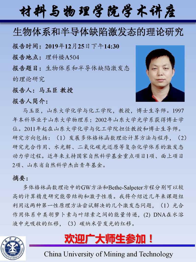 【学术讲座】生物体系和半导体缺陷激发态的理论研究