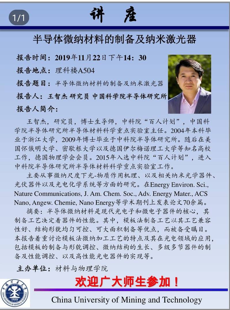 【学术讲座】半导体微纳材料的制备及纳米激光器