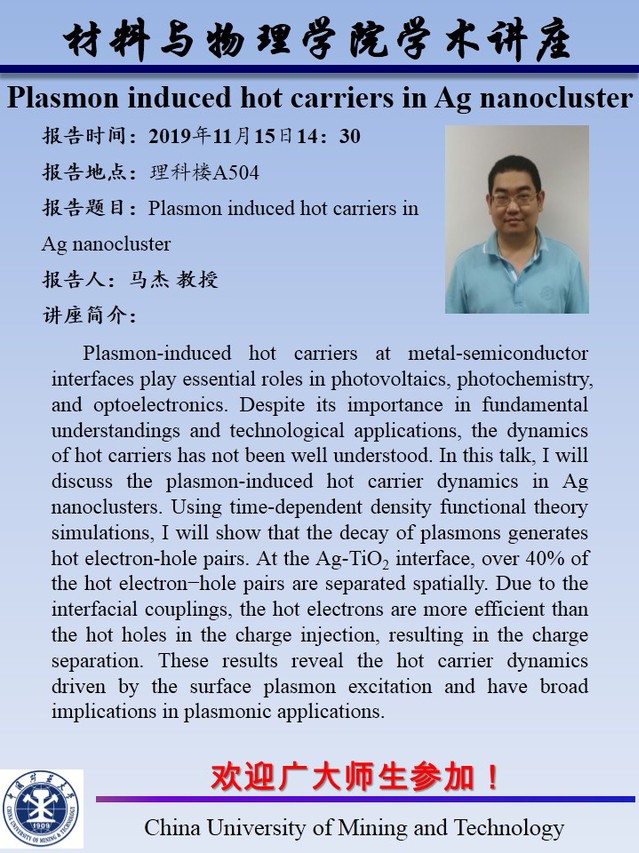 【学术讲座】Plasmon induced hot carriers in Ag nanocluster