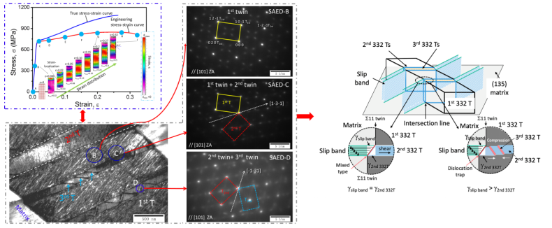 钛合金材料作为金属材料的一个重要分支,其强度与塑性往往表现出相互制约的倒置关系,存在高强度和高塑性无法平衡的问题。为了克服传统钛合金材料存在的诸如有限的延展性、差的加工硬化能力或低的抗损伤性等不足。威廉希尔williamhill官方网站威廉希尔张金勇博士与合作者法国PSL Research University大学Frédéric Prima,Fan Sun教授、美国麻省理工大学Ju Li教授共同开发出具有高强(屈服强度≈750MPa,抗拉强度≈1.1 GPa)、高塑性(延伸率>25%),高抗损伤性能和良好加工硬化行为的TWIP Ti-12Mo-10Zr钛合金。通过原位DIC(In-situ digital image correlation)实验还原了合金在加载过程中的应变分布,并利用EBSD和TEM技术详细表征了该合金的变形结构特征,结果表明该合金表现出高的抗局部应变集中容限,这是由于合金在变形过程中动态的应变硬化效应和多级{332}<113>变形孪晶的互相调节共同作用的结果。该研究成果以“Hierarchical {332}<113> twinning in a metastable β Ti-alloy showing tolerance to strain localization”为题,发表在国内国际金属材料领域高水平期刊Materials Research Letters, 8(7) (2020)247-253(中科院1区,IF=7.44)。https://www.tandfonline.com/doi/full/10.1080/21663831.2020.1745920. 这也是张金勇博士第三次在该期刊发表文章。