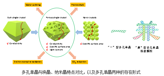 传统光(电)催化材料中,块晶导电性好,但比表面积过小;纳米晶比表面积大,但晶界多、界面电阻大。多孔单晶材料兼具二者优点,能在保证晶体完整性的同时提供足够多的活性位点,因此在太阳能电池、水裂解、CO2还原和污染物治理等领域具有广阔的应用前景。
